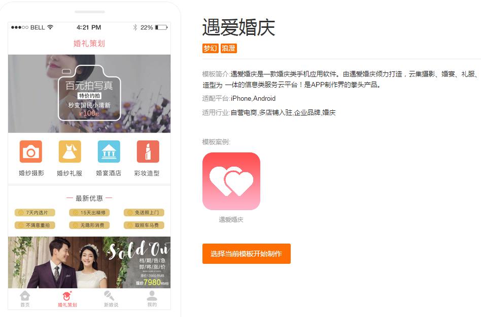 現(xiàn)在,婚慶影樓類的APP不需要重新開發(fā),在應用公園,已經(jīng)有多款成熟的整套原生APP模板可直接使用。