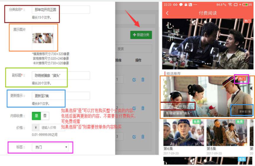 6、進入設置好的付費源中新增內容,分類填寫項目請參考手機截圖展示形式進行設置。