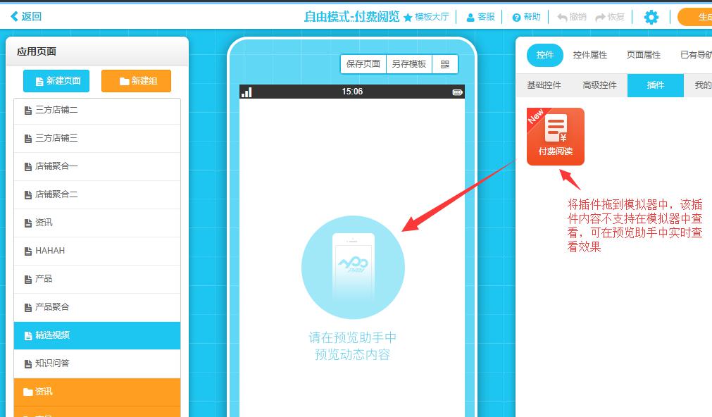 2、新建頁面,可以看到右側為常用的手機APP功能,比如聊天、產品、文本、圖片等等,找到付費閱覽的功能插件,然后拖入到中間的手機模擬器中就可以了。