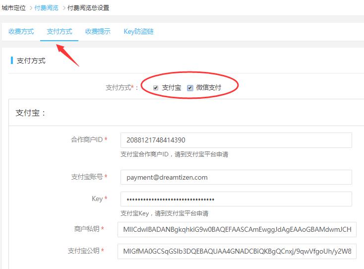 5、進入閱覽收費設置(收費方式、支付方式、收費提示、key防盜鏈),支付寶以及微信只能各設置一個賬號對接收款。