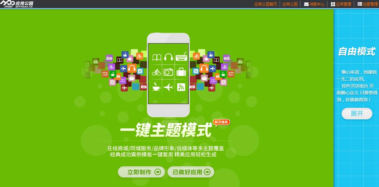 2、選擇開發(fā)模式,自由模式就是從零拼圖式制作APP;一鍵主題模式,就是利用那些APP模板制作。通常情況下,都可以找到符合自己需求的模板,按照模板制作。