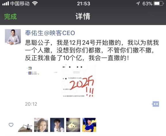分享另一個熱愛撒幣的人——映客創(chuàng)始人奉佑生,當然也不甘寂寞,加入這個撒幣大軍中。